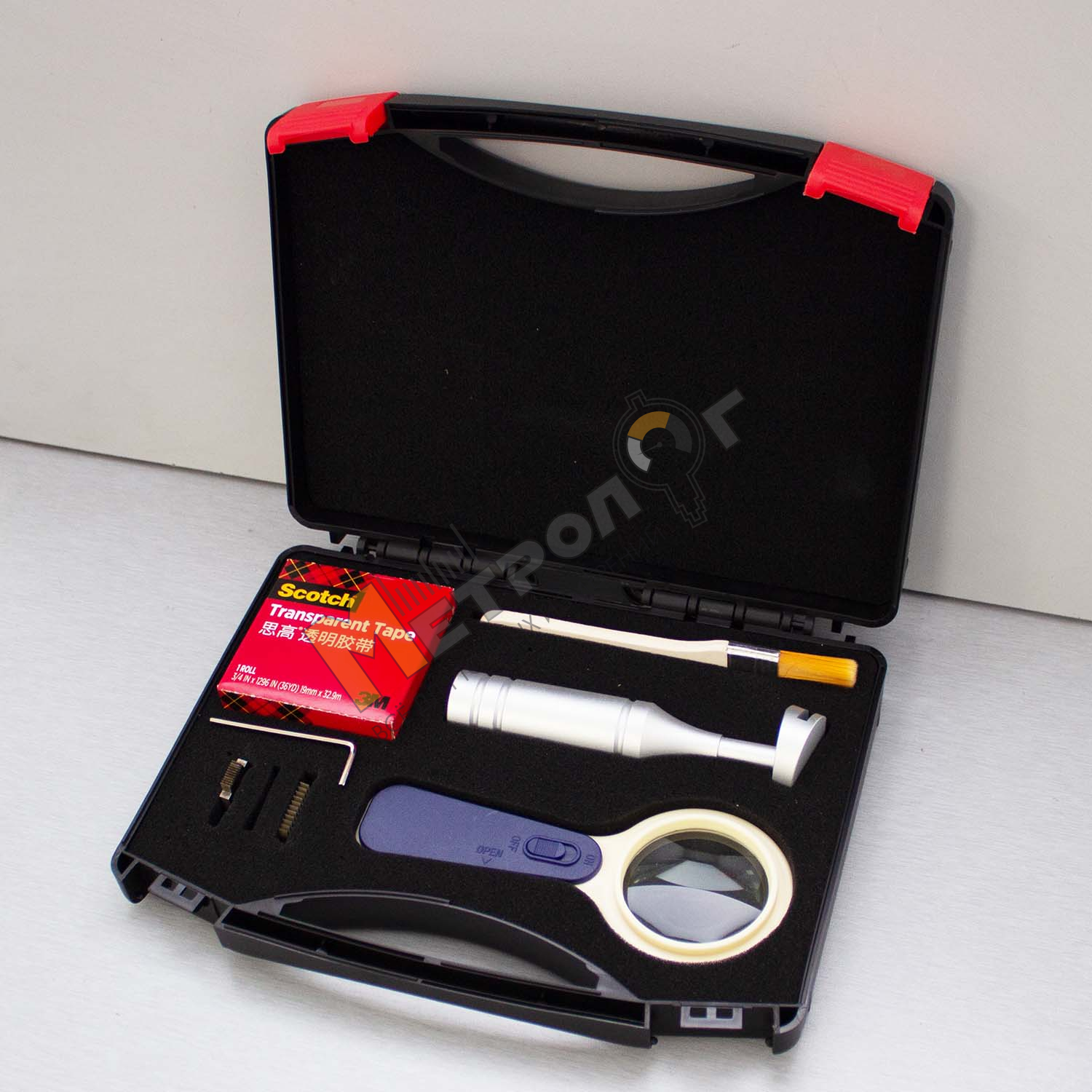 Прибор поставляется в пластиковом кейсе со щеткой, скотчем, увеличительной лупойи с двумя ножами - 1 и 2 мм между лезвиями.