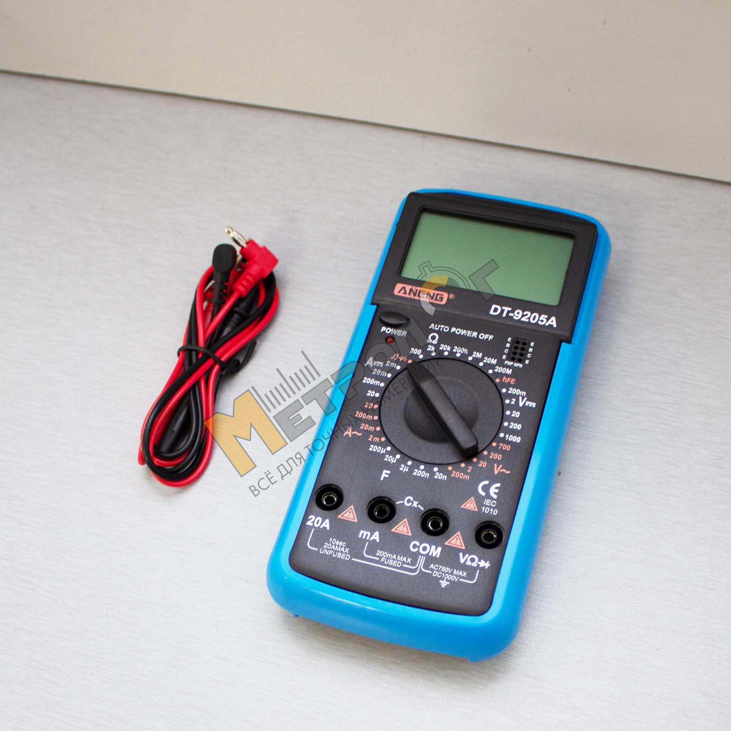 Мультиметр DT-9205А - цифровий мультиметр з функціями вимірювання постійної та змінної напруги, струму, опору, ємності, частоти, а також тестування провідності, діодів та коефіцієнта посилення транзисторів.